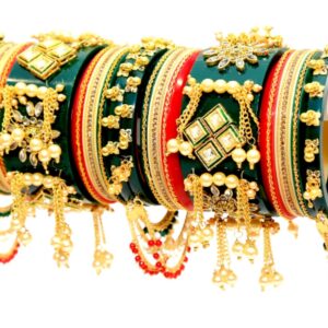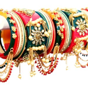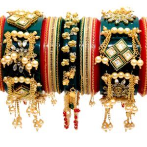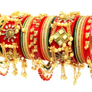 Chudas, sacred to Gujarati and Rajasthani brides, are bold and ceremonial. Crafted from polished ivory, durable resin, or radiant glass, they glow in scarlet and ivory hues, often inlaid with mirror work or gold leaf. Worn in symmetrical sets, their weight carries the pride of marital vows, their intricate carvings whispering tales of ancestry. Gifted during nuptials, chudas adorn a bride’s wrists for months, embodying devotion and new beginnings. Together, bangles and chudas are more than jewelry—they’re heirlooms of identity, tying modernity to heritage with every radiant clink.